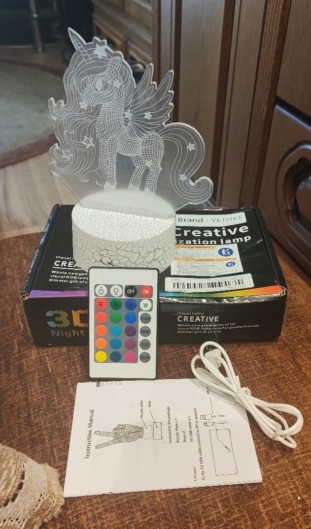 Lampka nocna z Jednorożcem na baterie oraz USB, z pilotem.
